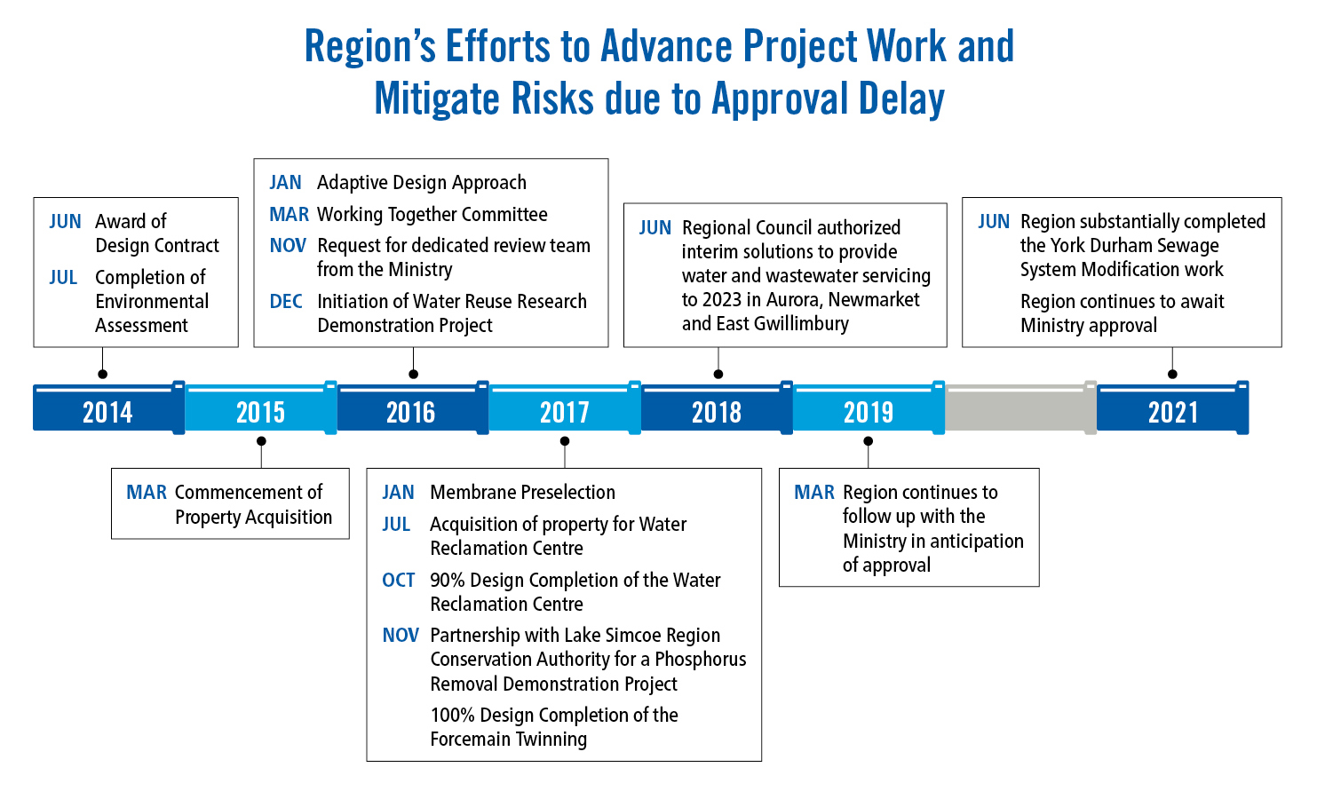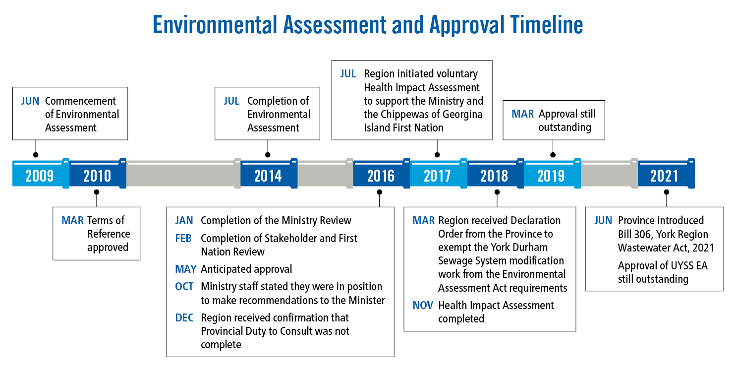 The Supporting Growth and Housing in York and Durham Regions Act, 2022 was passed on November 28, 2022. Through the Act, the Ontario government deemed the Upper York Sewage Solutions Individual Environmental Assessment withdrawn and replaced it with the York Region Sewage Works Project.