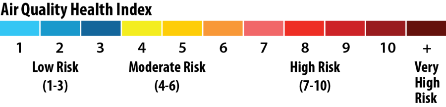 The AQHI uses a simple scale from one to 10+ to communicate the level of risk associated with the local air quality. The higher the number is, the higher the health risk and the greater the need for people to take precautions.