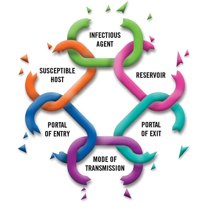 To understand how an infection spreads, think of a circular chain. Each link in the chain represents a step in the infection process. For an infection to spread, all links must be present. This is called the “chain of transmission”. If we remove one link (break the chain), the infection cannot spread. The goal of an effective infection prevention and control (IPAC) program is to break this chain and stop infections from spreading.