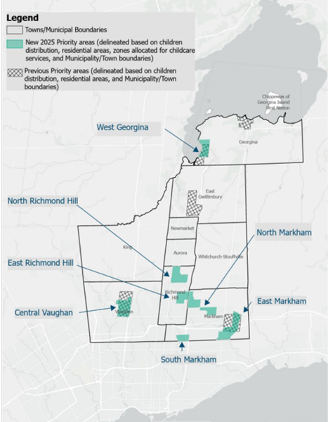 York Region has identified five neighbourhoods that best fit the provincial priorities under the CWELCC system: West Georgina, Central Vaughan, East Markham, North Markham, South Markham, North Richmond Hill and East Richmond Hill.