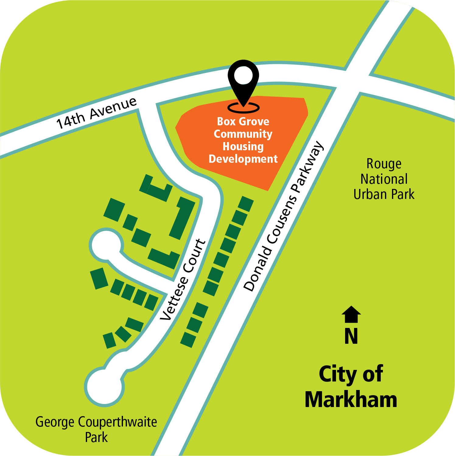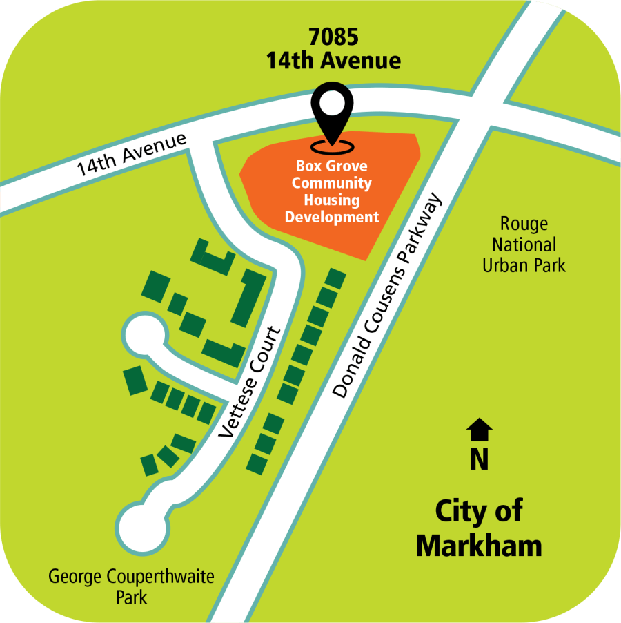 Located on the southwest corner of 14th Avenue and Donald Cousens Parkway, the 2.4-acre site is Region-owned and is currently vacant. The site is located close to amenities, including schools, the Box Grove Community Centre, and outdoor amenities spaces such as Rouge National Park. Major shopping centres with grocery stores, medical offices and daycare are within 1.5 kilometres of the site. The site is also serviced by York Region Transit.