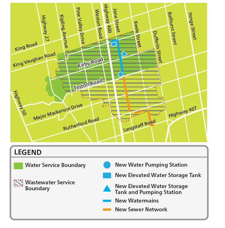 York Region's water and wastewater master plan update (2016) recommended municipal infrastructure projects to accommodate the growth expected in the northeast Vaughan service area. These recommendations are being reviewed as part of this study.