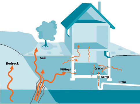 Radon is a colourless, odourless and tasteless radioactive gas. It is produced naturally in the environment when uranium in rock and soil breaks down. Radon gas released directly from the ground into the outdoor environment is diluted to low levels. Radon can enter a building anywhere there is an opening in contact with the soil. Radon gas can also enter a building through cracks and openings where the foundation is in contact with the soil. It can build up to high concentrations in poorly ventilated areas, like basements.