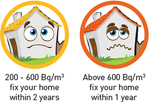 The Canadian radon guideline is 200 Bq/m3. Health Canada recommends homes with radon levels between 200 and 600 Bq/m3; be fixed within two years; homes with radon levels above 600 Bq/m3 should be fixed within one year.