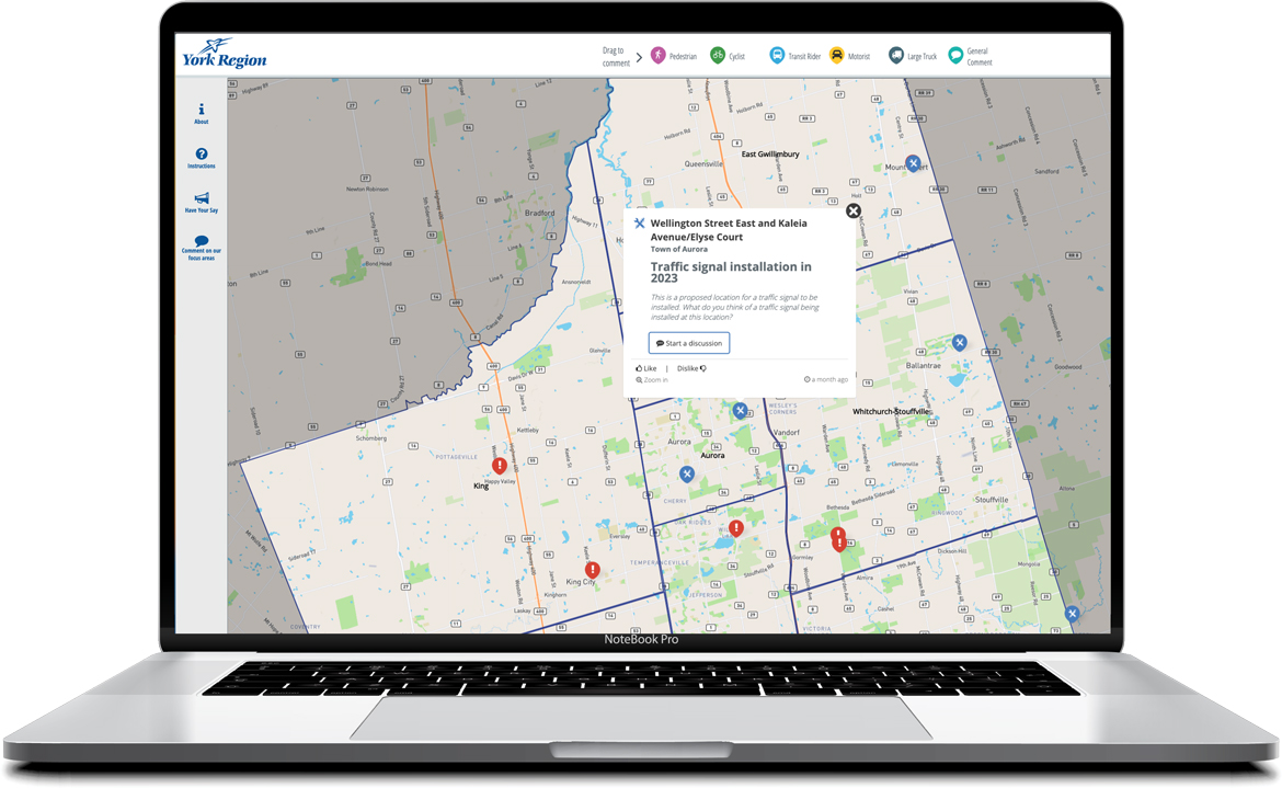 The Region reached out to engage the public in this study. The study relied on various resources to identify the potential safety concerns within the Region, including historical collision data, police citations, hospital data, and inputs from different stakeholders and the public. Therefore, the Region contacted residents and community members to inform them of the study and requested them to participate in the engagement process through the project website and its online features, including online public opinion surveys and a Crowd Map tool.