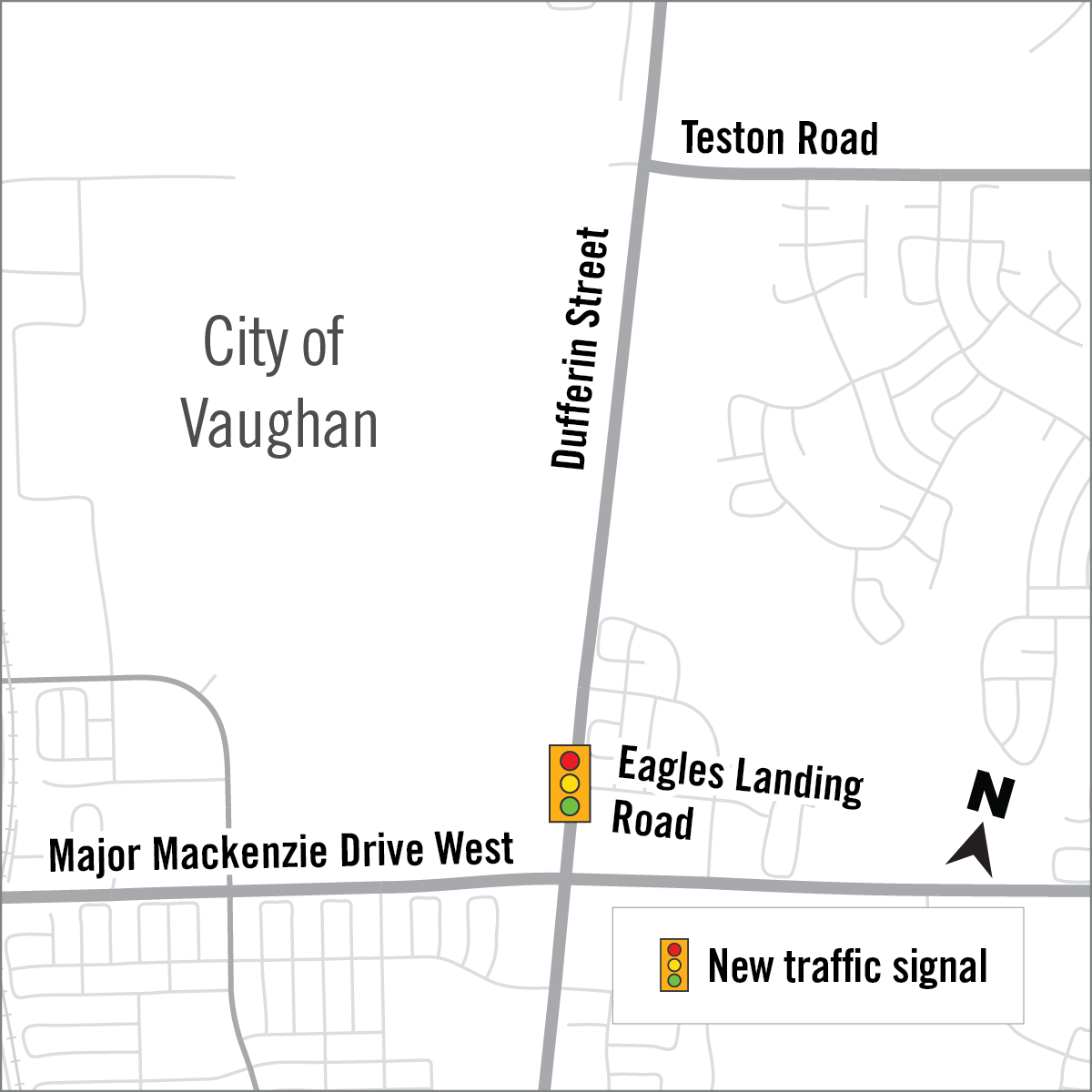 York Region is installing new traffic signals, including audible pedestrian signals and pavement markings to enhance crosswalk visibility. Traffic signals at the intersection of Dufferin Street and Eagles Landing Road will help manage increasing traffic volumes and reduce delays.