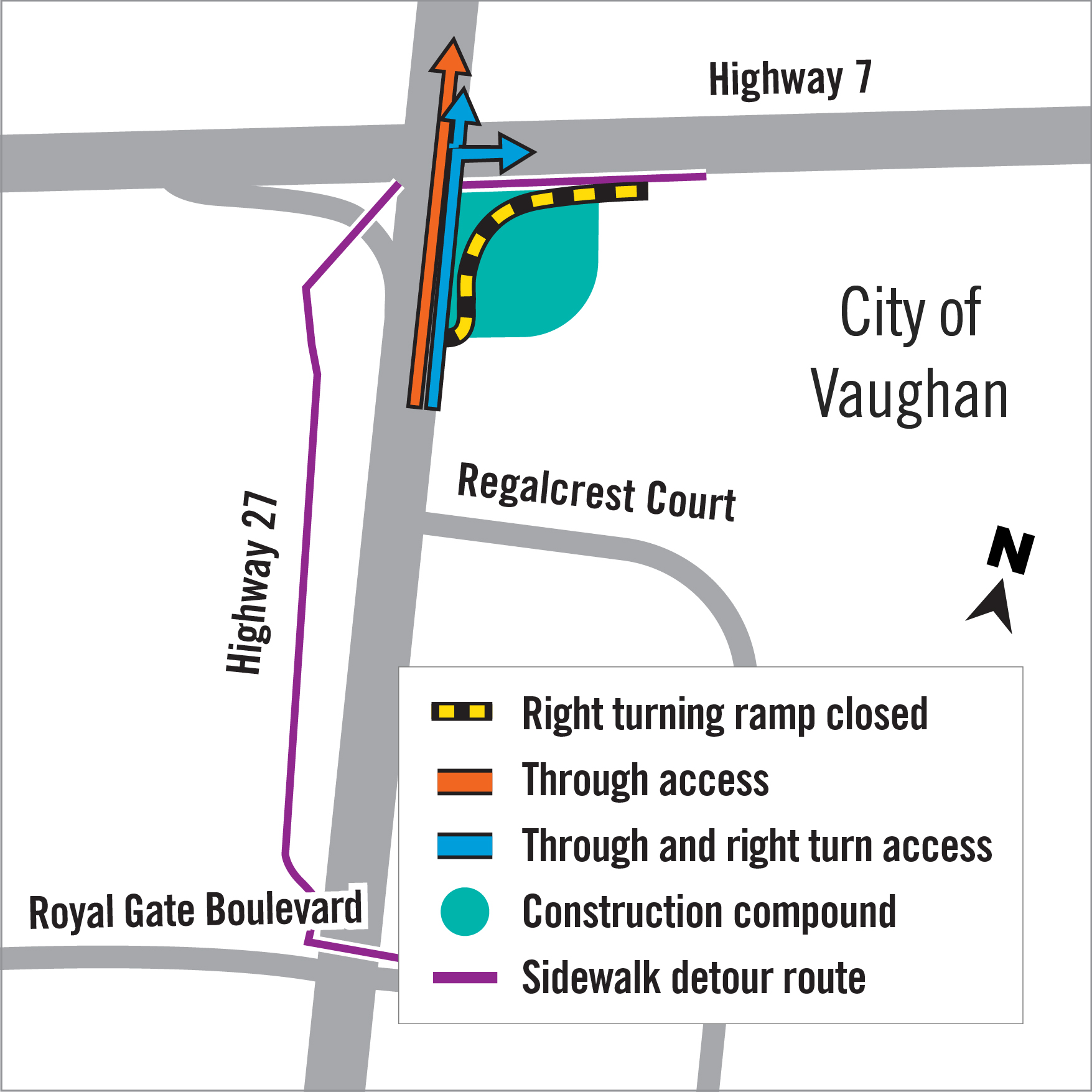 - Pedestrians are advised to follow directional signs as temporary sidewalks and detours will be in place around the construction compound