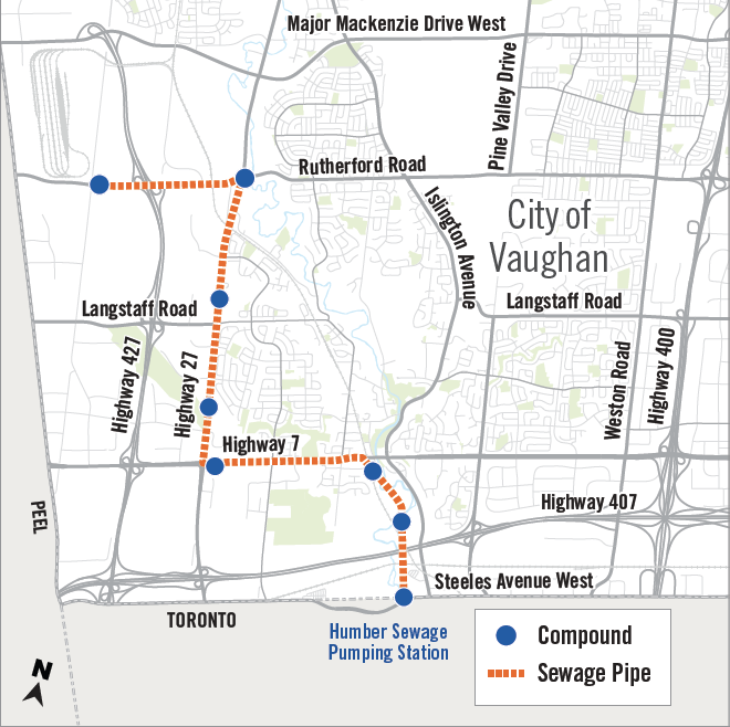 - Building a new 11-kilometre gravity sewer pipe between Rutherford Road, Highway 27, Islington Avenue and Steeles Avenue West in the City of Vaughan