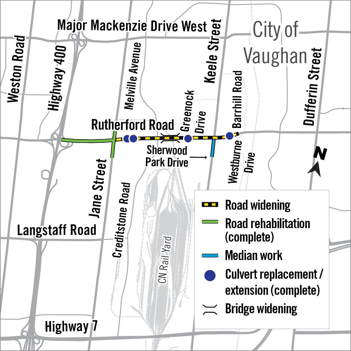 - Rutherford Road is reduced to one lane in each direction between Creditstone Road/Melville Avenue and Greenock Drive to accommodate work on the CN Rail bridge