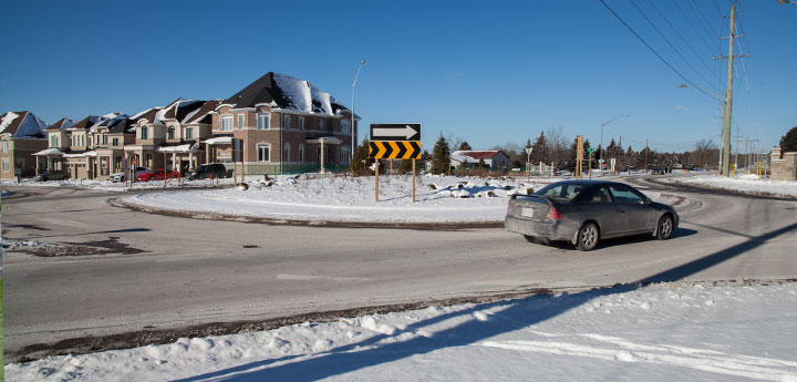 Three roundabouts have been installed by the Region to improve mobility needs. The first Regional roundabout was installed in fall of 2013 at the intersection of York/Durham Line and Durham Regional Road 5 in the City of Markham, as shown in the figure below. This was followed in 2016 with the implementation of roundabouts at Ninth Line and Bayberry Street in the Town of Whitchurch-Stouffville and Lloydtown-Aurora Road and Keele Street in the Township of King. Two roundabouts on Regional roads have also been implemented by other jurisdictions including the Province at the intersection of Highway 48 and Bloomington Road in 2018 and Durham Region at the intersection of Lake Ridge Road and Pefferlaw Road both in 2019.