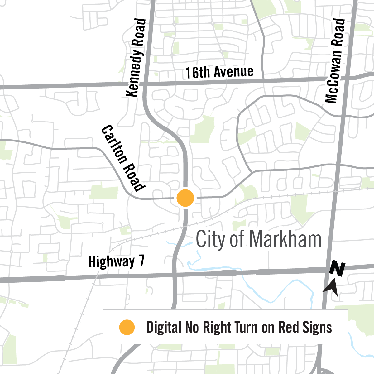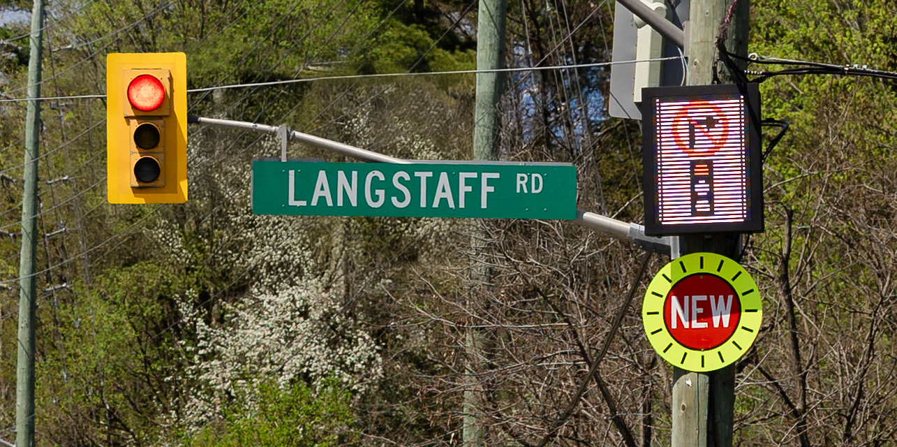 York Region piloted a new digital no right turn on red sign for six months at the intersection of Islington Avenue and Langstaff Road in the City of Vaughan for northbound travellers on Islington Avenue turning right onto Langstaff Road. The sign is the first one used in Ontario in this way. Following the success of the pilot, the Region will be replacing existing no right turn on red (NROR) static signs with digital no right turn on red signs at 50 locations in the next few years.