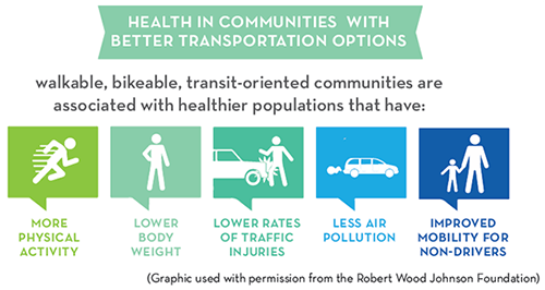 | How it impacts health | A transportation network that promotes active and non-motorized transport for commuting and daily activities creates more accessible, sustainable, equitable, inclusive and healthy communities.