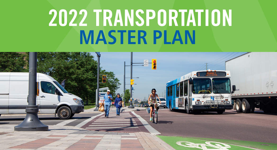 Words that say 2022 Transportation Master Plan and an intersection showing vehicles and people crossing the street