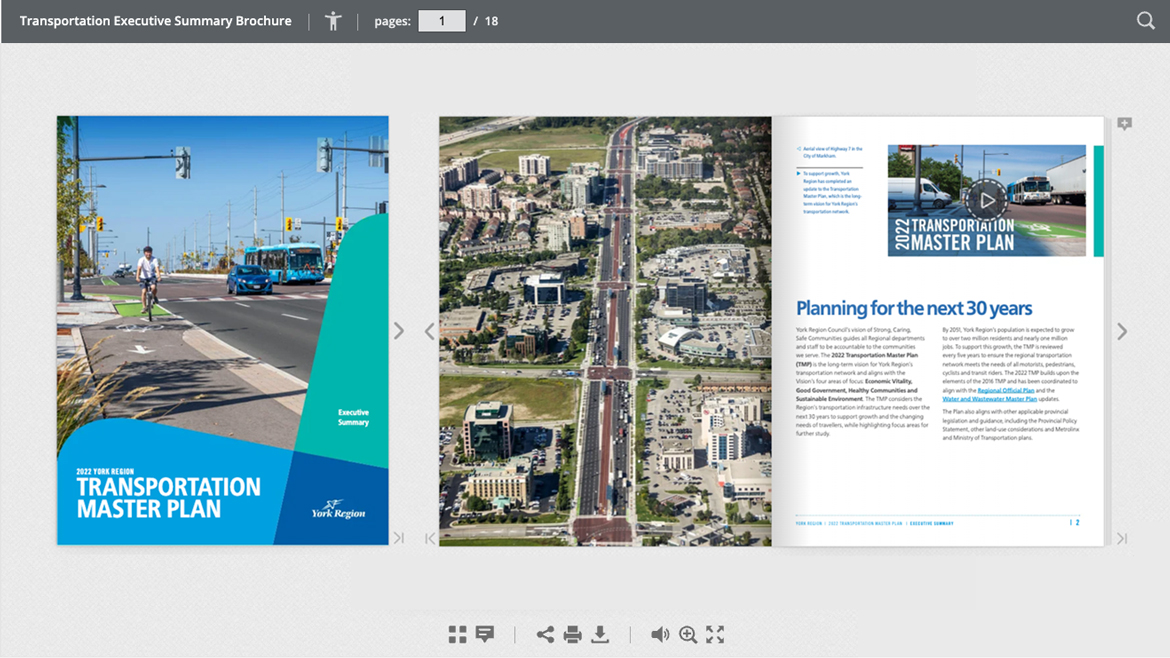 The TMP is the long-term vision for York Region’s transportation network, encompassing strategy, initiatives and infrastructure. The plan looks ahead 30 years and considers the Region’s transportation infrastructure needs to support growth and the changing needs of travellers. It supports healthy communities and economic growth by planning for safe, reliable travel and efficient movement of goods.