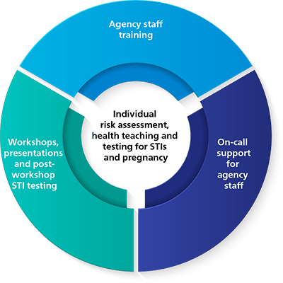 The sexual health clinics program developed an outreach initiative framework to provide access to sexual health promotion and clinical services for at risk priority populations. Components of the framework included partnering with community agencies to provide individual risk assessments, health teaching and testing for sexually transmitted and blood-borne infections and pregnancy; agency staff training to promote sexual health; on call support for agency staff and workshops and presentations for clients of community agencies that provide services to at risk priority populations. In 2018, clinical sexual health services were provided at 6 agencies with a total of 40 individuals tested for sexually transmitted and blood-borne infections, 80 individuals attended outreach events and 50 individuals were provided with risk assessment, health teaching and/or referral.